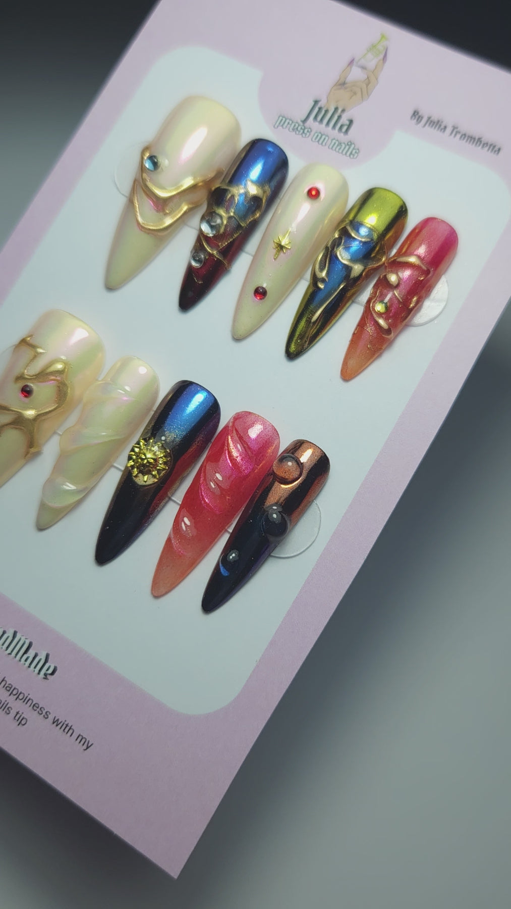 Set de nail art avec effet de chrome, motifs 3D et bijoux