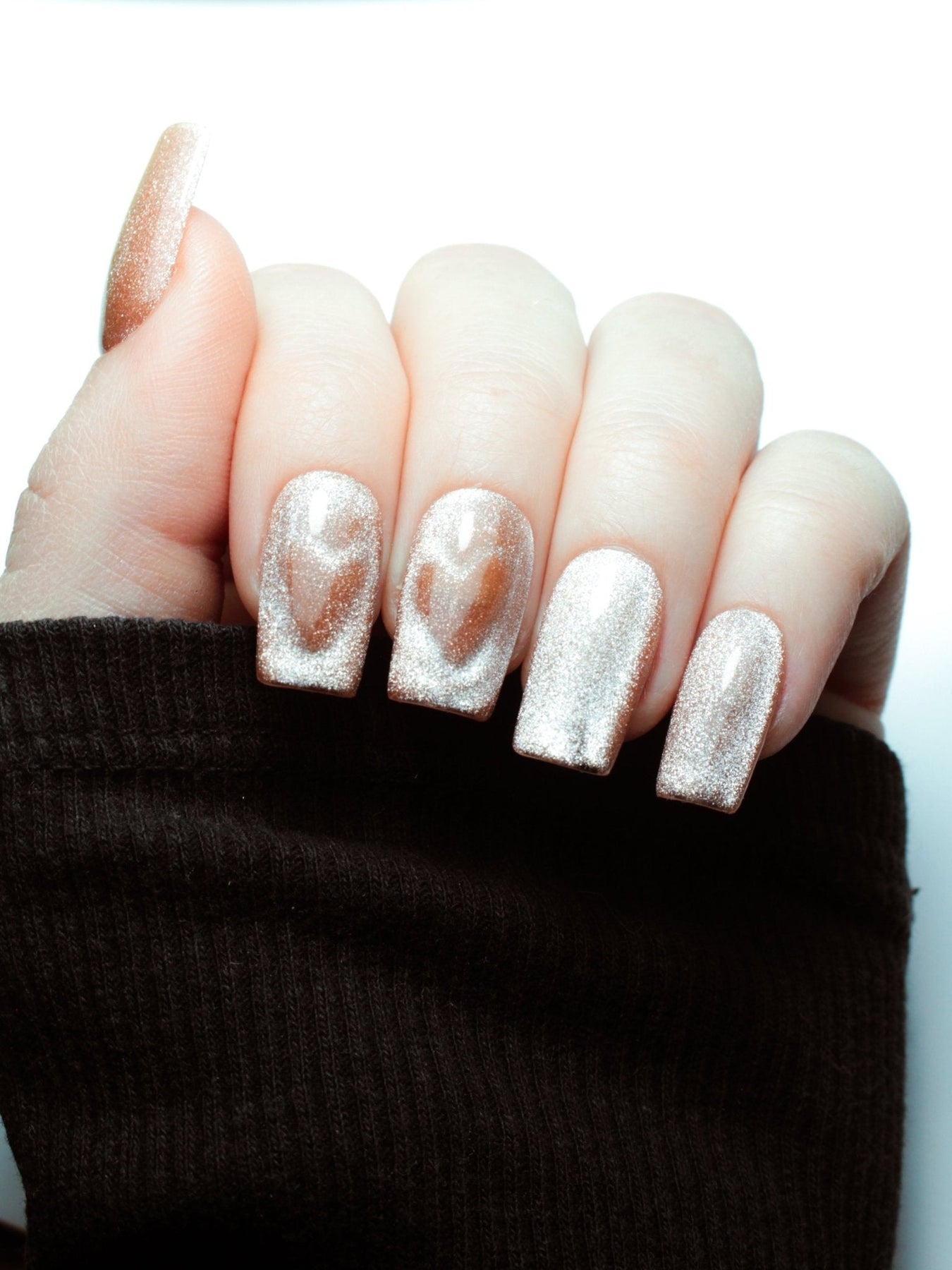Faux ongles cat eyes nude, cœur en reflets sur l'index et le majeur