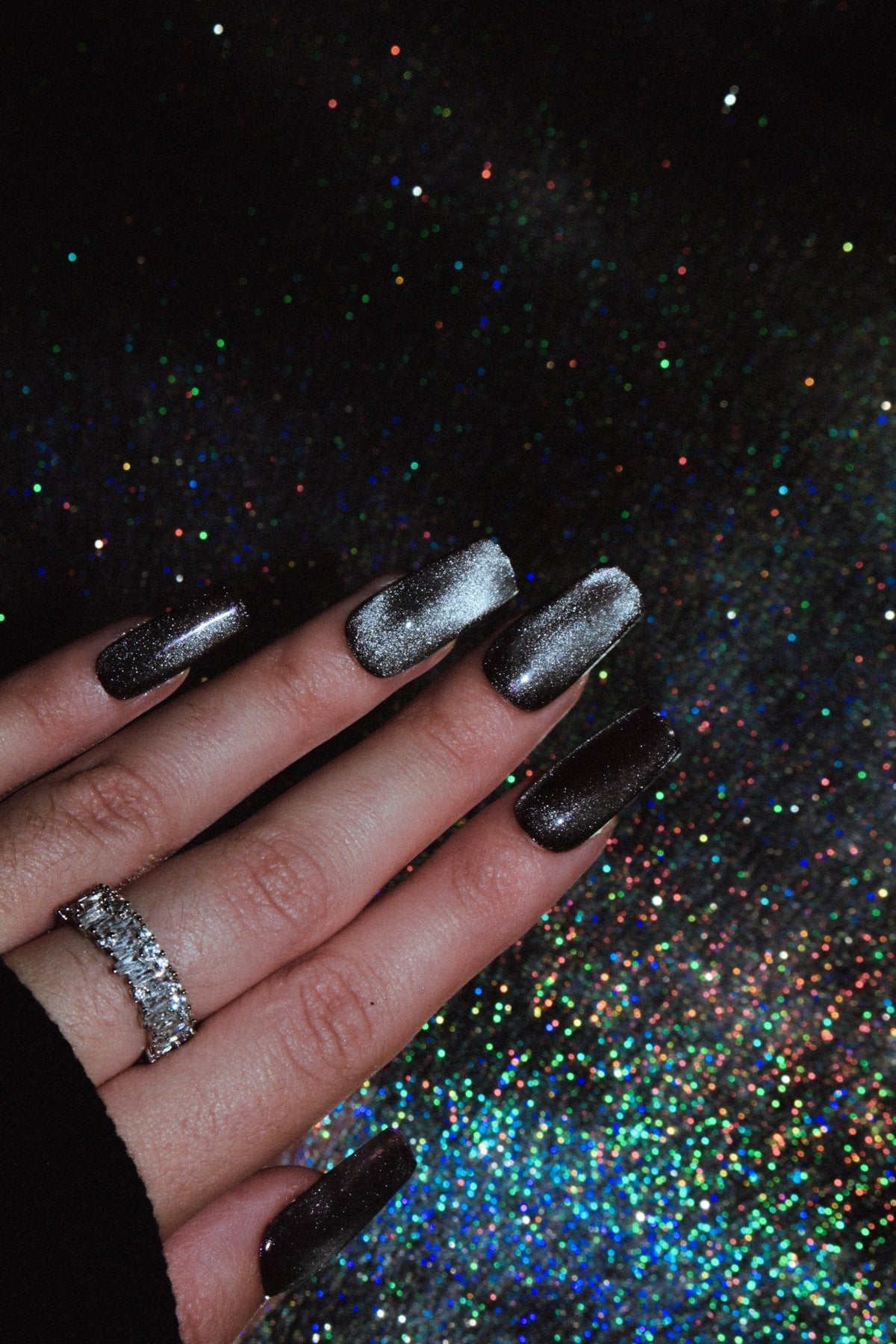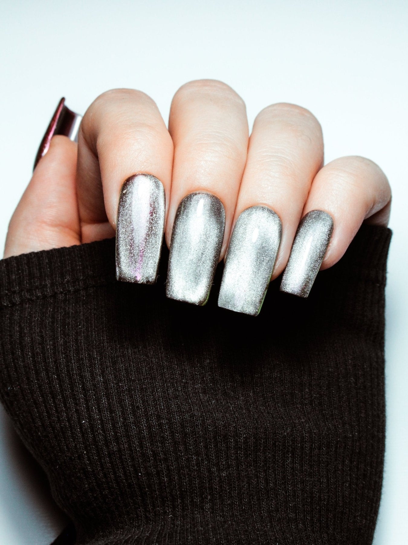 Faux ongles base marron foncé et effet cat eyes argenté