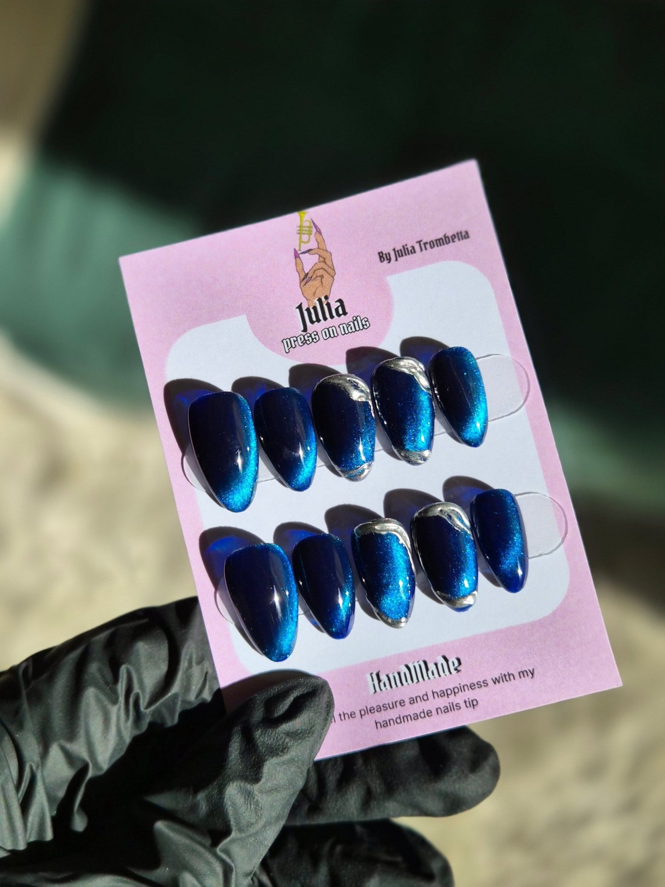 Nail art reflet cat eyes bleu, détails en reliefs argentés