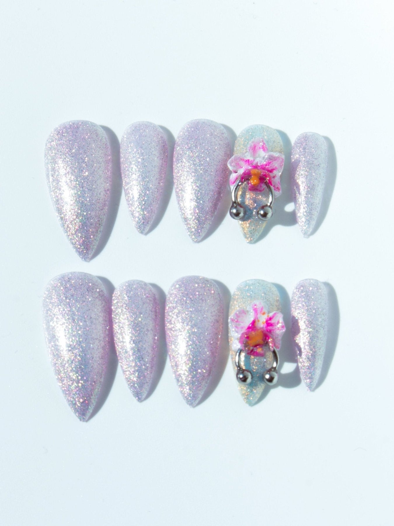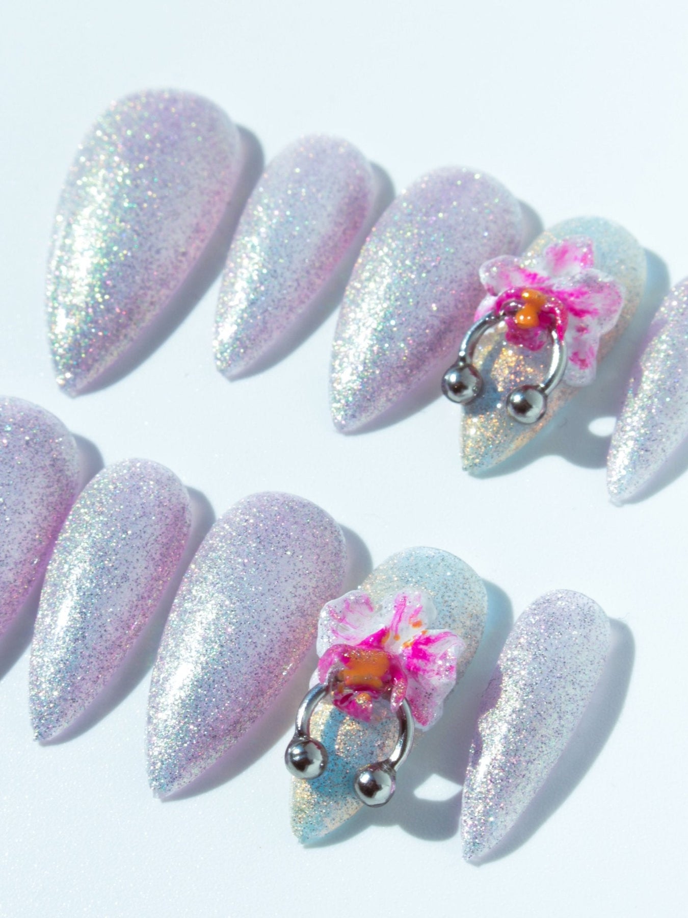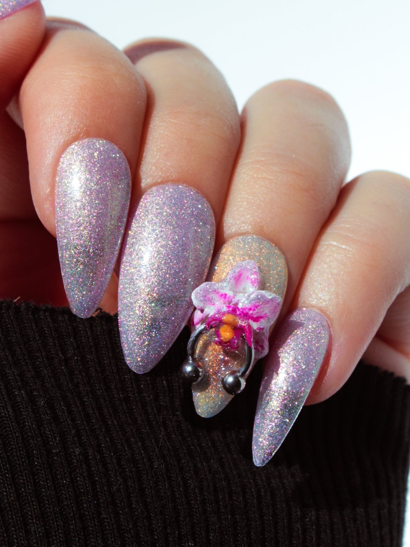 Vernis pailleté rose avec reflets vert, détail en 3D d’une orchidée avec un bijou piercing incrusté.