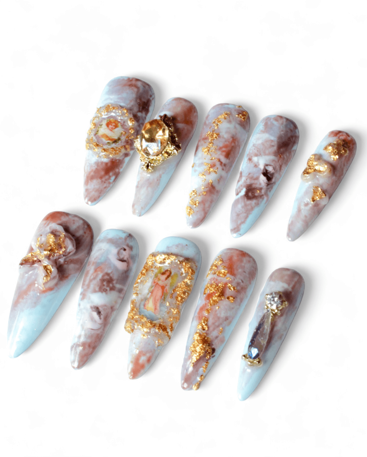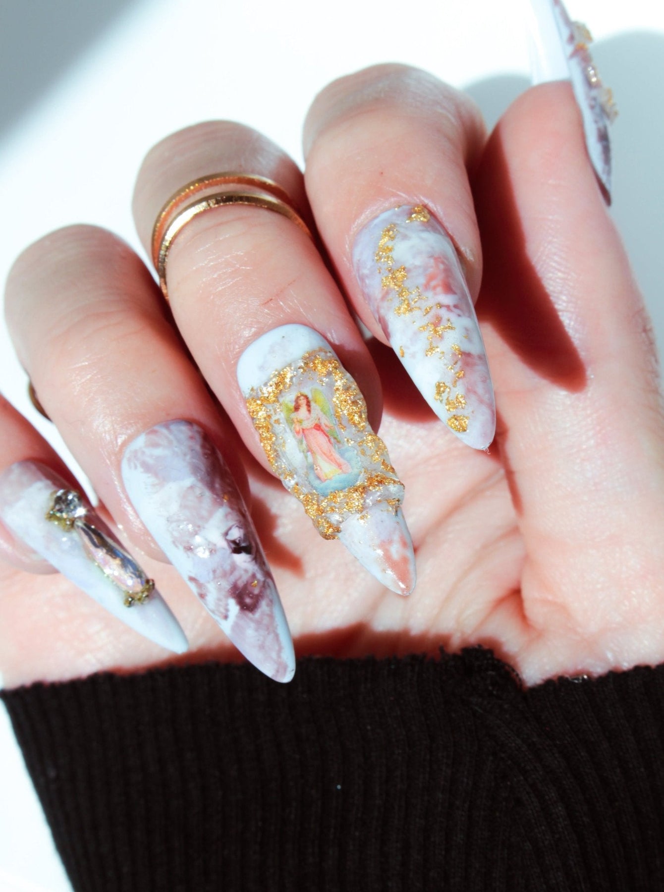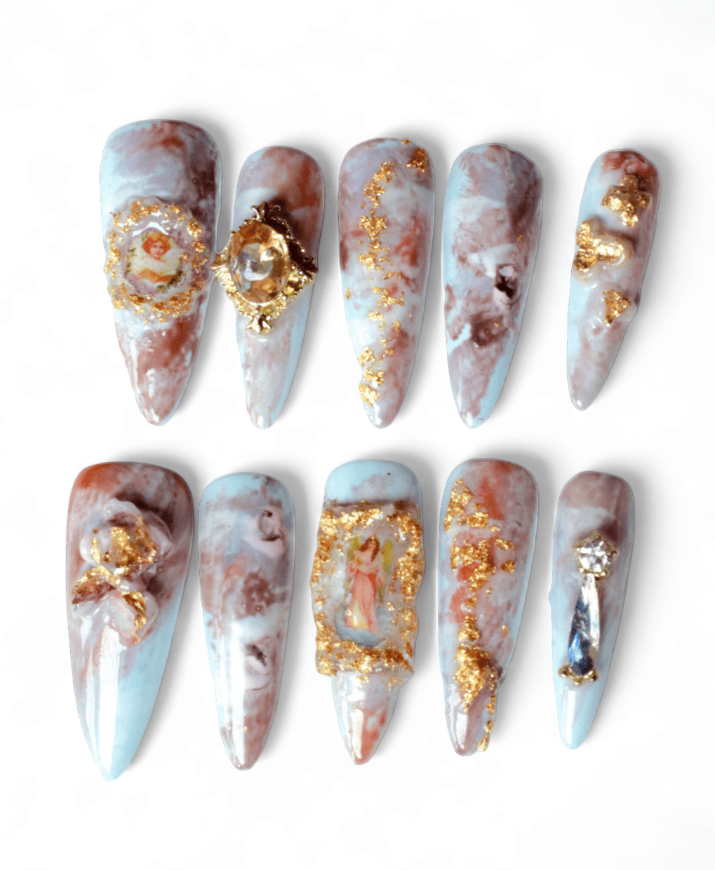 Nail art inspiré du mouvement Rococo, avec fleurs en 3D, pose de bijoux, stickers et feuilles d'or
