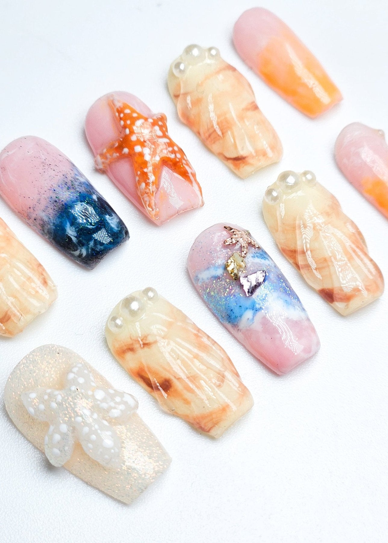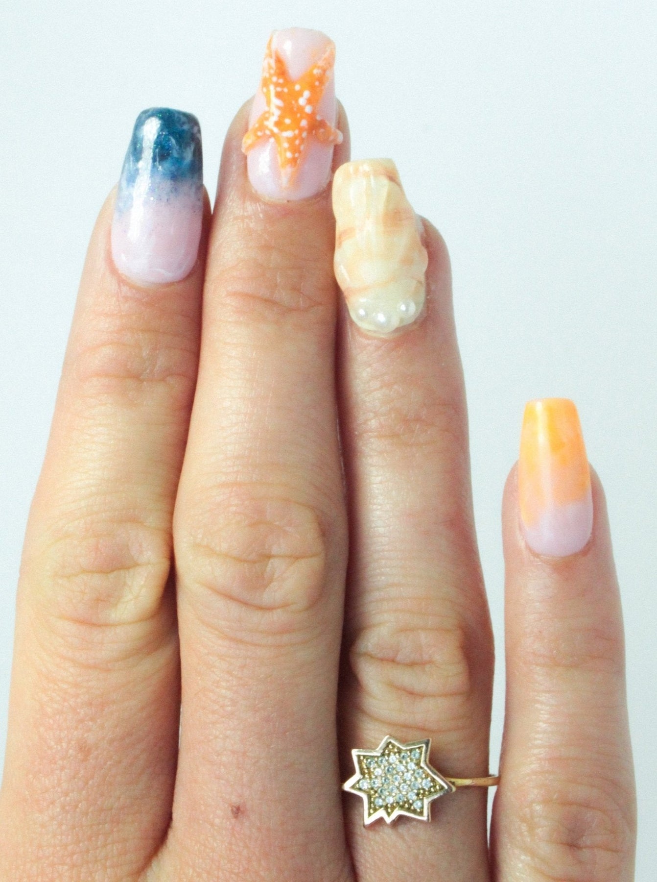 Mix & Match de nail art effet coquillage, mer, et étoiles de mer en relief