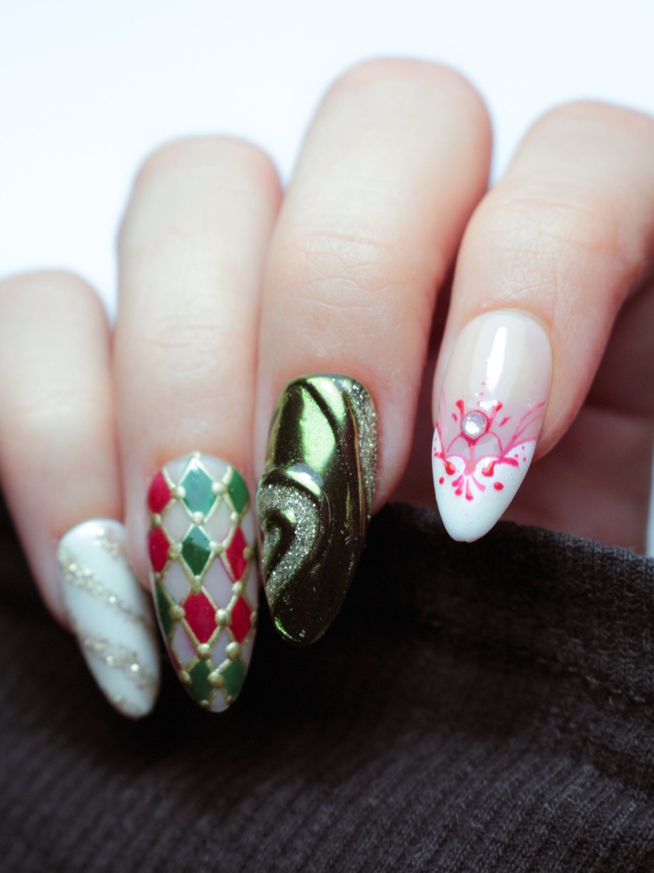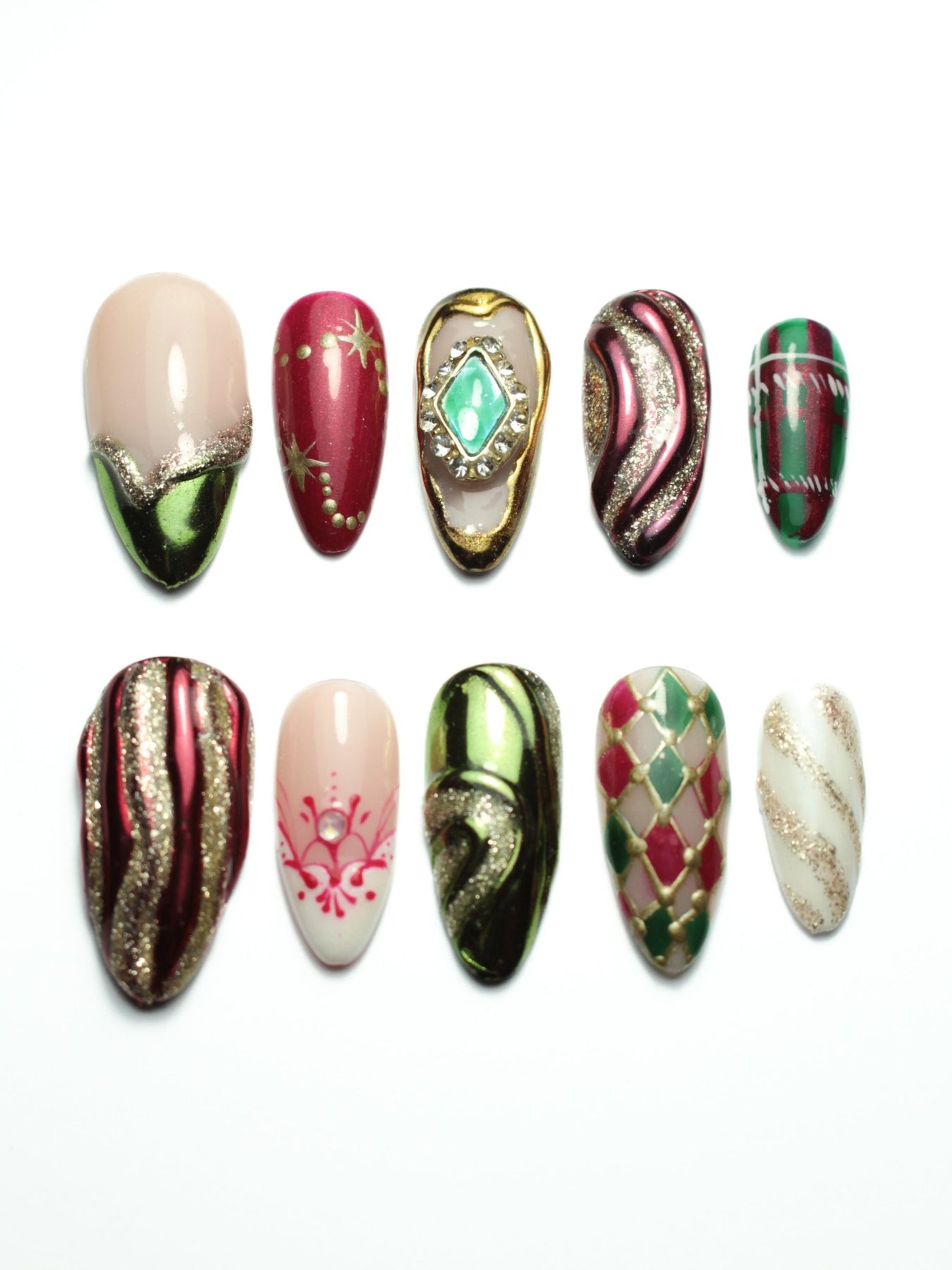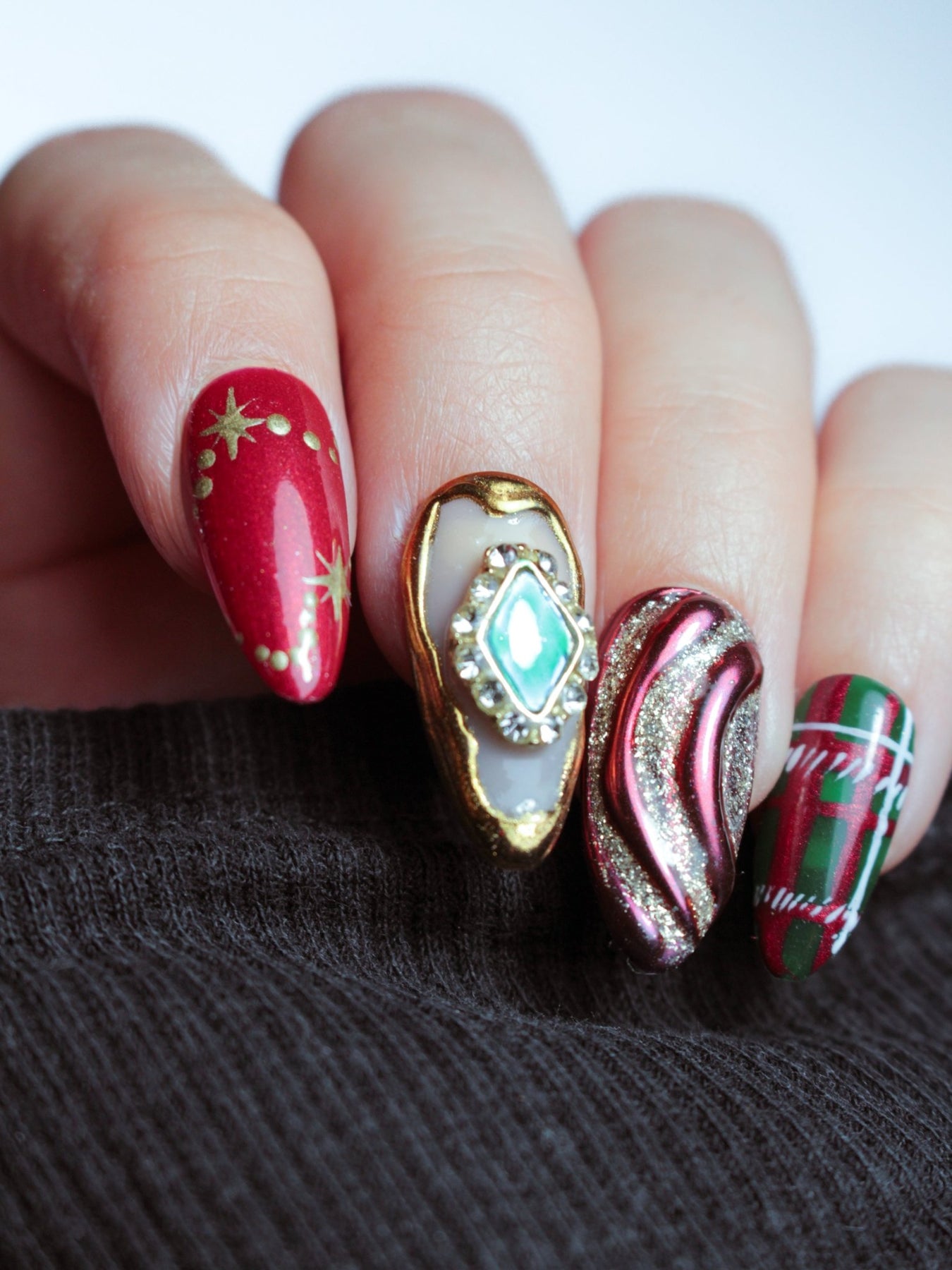 Nail art inspiré des décorations de Noël des années 90/2000, motifs dépareillés, bijoux, reliefs chromes et pailletés