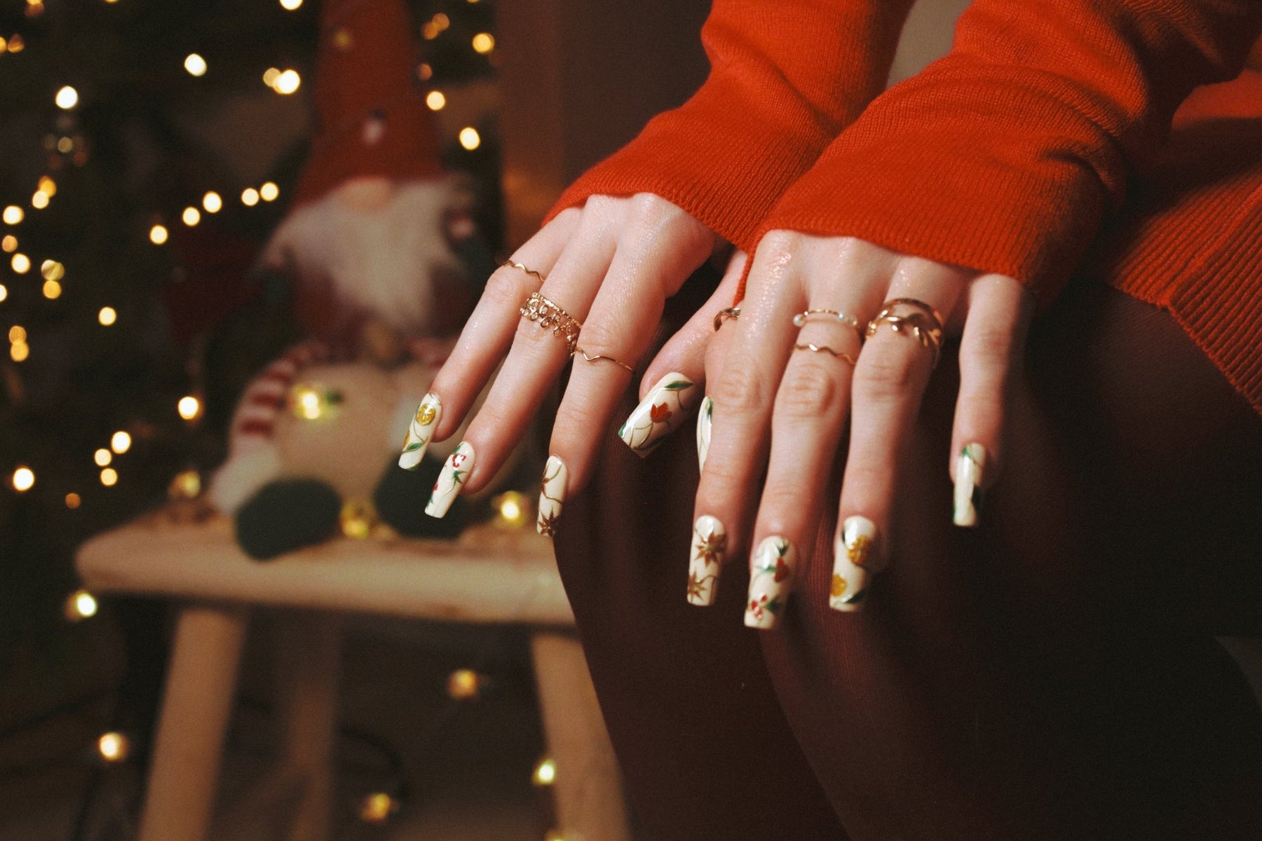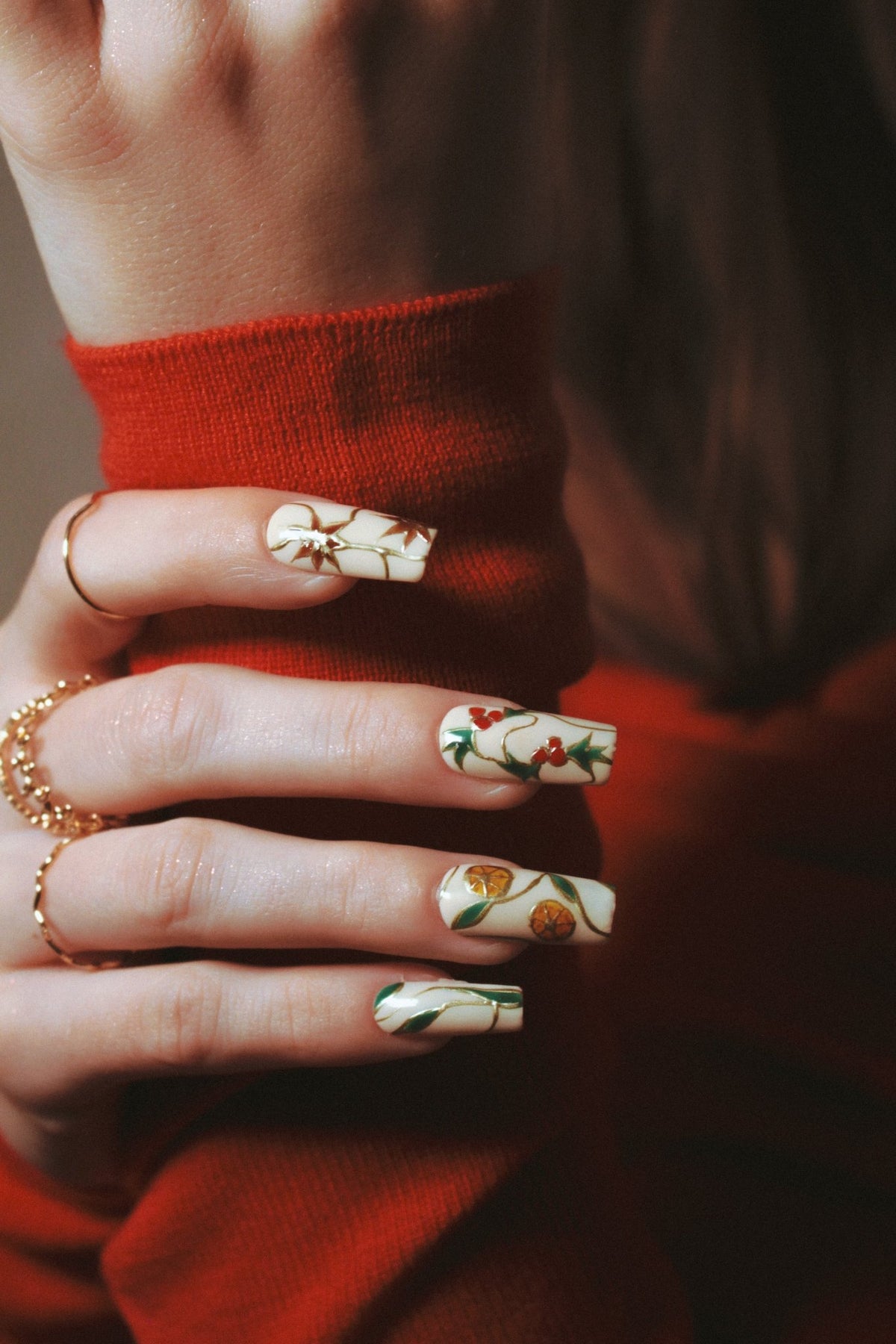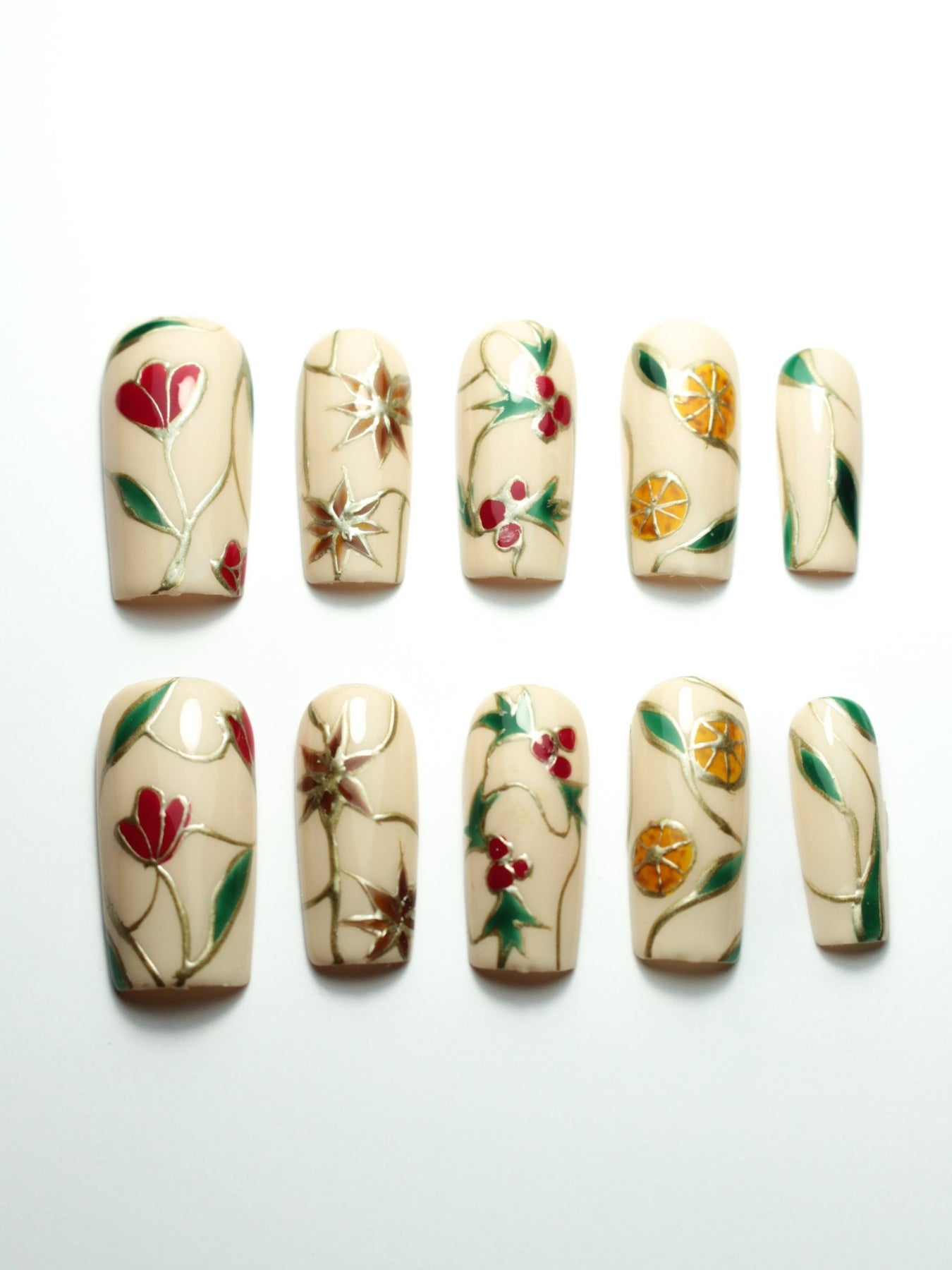 Nail art inspiré des vitraux d'églises, avec des éléments de Noël, houx, oranges séchées et anis étoilés